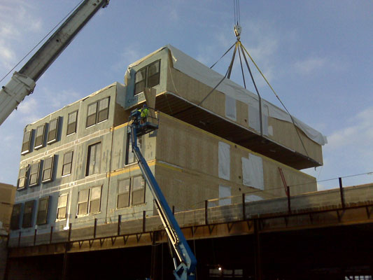This photo shows the setting in place of a third floor unit. The units were virtually complete when delivered including carpet, paint & fixtures. In the field hook ups were made for electric, plumbing, potable water & sprinklers. Once the units were set, their common walls were not accessible for structural connections. The setting sequence & interconnection method took some innovation.