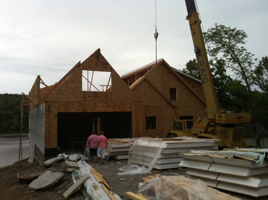 I was the structural engineer of record. SIPs are structural insulated panels which consist of osb skin glued to a foam interior. I designed the roof & wall SIPs on this house, the support beams, columns, floors and foundation.